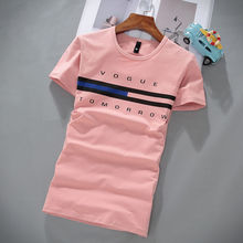 2016夏季新款港仔文艺男短袖t恤小清新粉红色条纹半袖夏装衣服潮