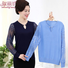 中年妈妈装秋装蕾丝针织衫长袖40-50-60岁中老年女装大码t恤上衣