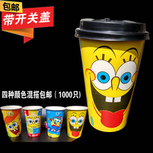 一次性500ML海绵宝宝奶茶咖啡果汁纸杯子热饮杯带盖批发包邮
