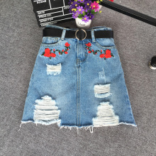 夏季韩国新款 高腰玫瑰绣花牛仔半身裙破洞百搭A字裙短裙 送腰带
