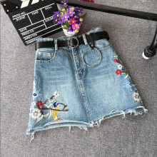 2017夏韩国新款 防走光洋气孔雀绣花牛仔A字裙百搭半身裙 送腰带