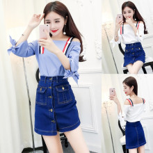2017春夏新款女装时尚蝴蝶结背带漏肩上衣+修身洗水牛仔裙套装潮