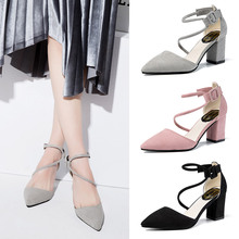 2017春季新款韩版尖头高跟鞋粗跟浅口脚环绑带单鞋百搭罗马女鞋子