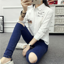 白色衬衫女长袖2017韩范学院风刺绣中长款宽松简约百搭休闲衬衣潮