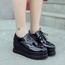 松糕底单鞋春季2016新款圆头厚底内增高女鞋学生深口系带坡跟皮鞋