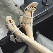 2017新款 欧美复古罗马风露趾T型鱼骨细带搭扣后空粗跟高跟凉鞋女