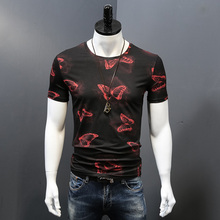 青年欧洲站夏季蝴蝶民族风印花修身男士短袖T恤红色男半袖体恤衫
