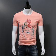韩版日系修身男士t恤短袖潮学生个性玫瑰花骷髅印花青少年春夏装