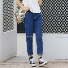 纯曼琳春秋季BF风日系显瘦9分破洞牛仔裤女宽松小脚九分裤哈伦裤