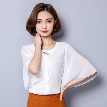 2017夏季新款上衣百搭纯色圆领喇叭袖雪纺衫