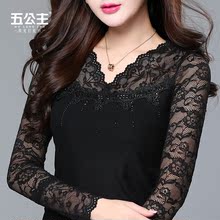五公主V领蕾丝打底衫2016秋装新款镶钻拼接网纱长袖T恤女纱衣薄款
