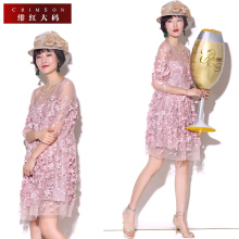 绯红大码女装春秋七分袖圆领镂空中长款连衣裙胖mm宽松蕾丝公主裙