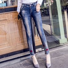2017春夏新款欧洲站嘴唇刺绣磨破牛仔裤女九分裤紧身小脚铅笔裤潮