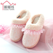 棉拖鞋包跟 蕾丝厚底家居拖鞋情侣室内保暖毛毛鞋居家冬季拖鞋女