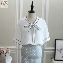 莉家夏季新款日系甜美文艺范撞色系带蝴蝶结宽松雪纺衫衬衫