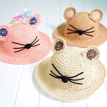 春夏儿童猫咪草帽男女宝宝沙滩帽夏季遮阳帽子纯手工编织大檐草帽