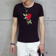快手红人同款短袖男潮流修身夏季情侣装T恤刺绣玫瑰花半袖男社会
