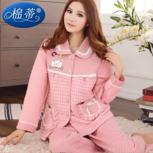 秋冬季女士睡衣女三层薄夹棉精梳棉春秋季加厚开衫长袖家居服套装
