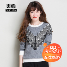 16热卖秋冬新款圆领羊绒衫时尚短款针织衫甜美蕾丝修身套头毛衣女