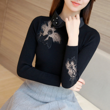 2016秋冬装女士蕾丝刺绣针织打底衫修身显瘦长袖低领套头性感毛衣