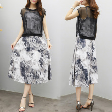2017夏季新款韩版显瘦印花中长款大摆褶皱裙子女雪纺连衣裙两件套