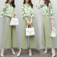 2017新款女装春两件套裤雪纺印花七分袖上衣阔腿裤休闲时尚套装女
