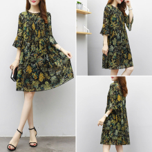 2017夏季新款女装时尚韩版宽松裙子喇叭袖碎花印花雪纺连衣裙女夏