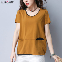 2017夏装新款棉麻短袖t恤女 大码撞色修身圆领宽松上衣女胖MM体恤