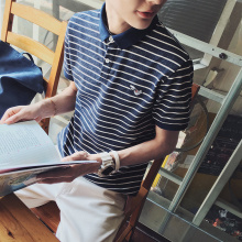 polo衫短袖男修身韩版条纹日系潮牌港风小清新文艺学生微领刺绣