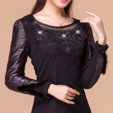 2016冬装新款韩版女蕾丝打底衫修身PU蕾丝拼接裙摆加绒中长款上衣