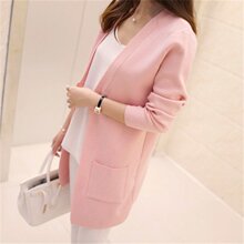 韩版无扣中长款修身针织衫V领长袖开衫女装毛衣纯色外套2017新款