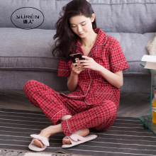 夏季短袖睡衣纯棉家居服格子长裤大码女全棉薄款春秋中年妈妈套装