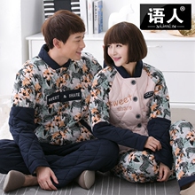 语人秋冬季夹棉情侣睡衣男加厚保暖家居服女长袖纯棉大码睡衣套装