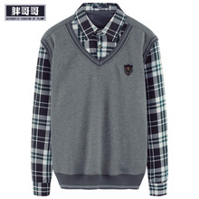胖哥哥大码加绒加厚男士加肥加大毛线V领格子保暖衬衫男假两件