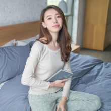顶瓜瓜顶呱呱罗纹弹力棉秋款长袖女睡衣套装圆领套头家居服蕾丝边