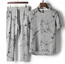 深八度浅色夏季套装男 褶皱竖条纹 浅灰色短袖九分裤运动休闲套装
