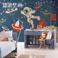 思舍儿童房墙纸男孩卧室墙布卡通壁纸个性壁画定制手绘太空宇航员