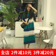 夏装女装2017新款韩版撞色宽条纹中长款短袖T恤连衣裙宽松上衣潮