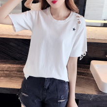 破洞t恤女短袖2017夏装新款韩范宽松百搭学生漏肩上衣v领半袖体恤