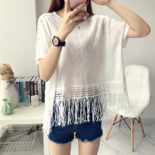 2017夏季新款韩版白色t恤女短袖宽松显瘦bf流苏上衣休闲镂空罩衫