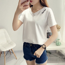 2017夏装新款韩版破洞t恤女短袖宽松百搭bf上衣学生v领半袖体恤潮