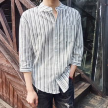 春季新品宽松男士条纹立领衬衫薄款时尚休闲青年落肩七分袖衬衣潮