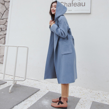 2016秋冬新款韩国东大门实拍米灰色连帽系带手工双面羊绒大衣孤品