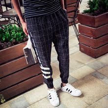 夏季新款休闲裤男士棉麻格子裤加大码束脚裤哈伦裤小脚潮男长裤子