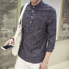 秋季日系套头格子七分袖衬衫男士加肥加大码立领中袖潮男衬衣寸衣