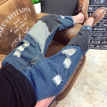 破洞拼色9九分裤牛仔裤男加肥加大码宽松小脚哈伦裤潮胖春季青年