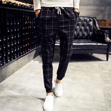 春季港风格子休闲裤男士加肥加大码潮束脚裤韩版哈伦裤小脚男裤子