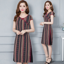 夏装2017新款女装修身显瘦中长款中年印花雪纺短袖改良旗袍连衣裙