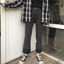 韩国复古做旧个性潮流纯色百搭牛仔裤直筒九分裤学生宽松百搭女裤