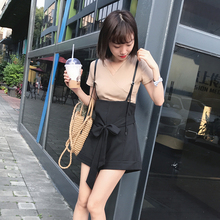 春夏新品韩版背带裤两件套一字领露肩T恤+高腰背带阔腿短裤套装潮